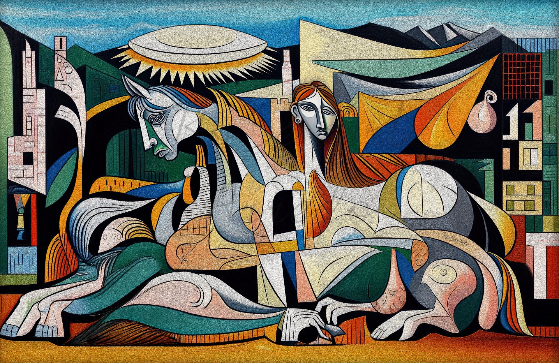 In a tapestry of fractured lines and vibrant colors, a proud horse lies wounded — a symbol of strength and fragility.Beside him, the silent figure of a woman keeps vigil, guardian of an ancient sorrow.Light and shadow duel beneath a broken sun, as Cubism reveals the hidden truths within every fragment.An artwork that speaks of dignity, resilience, and the eternal struggle between destruction and hop