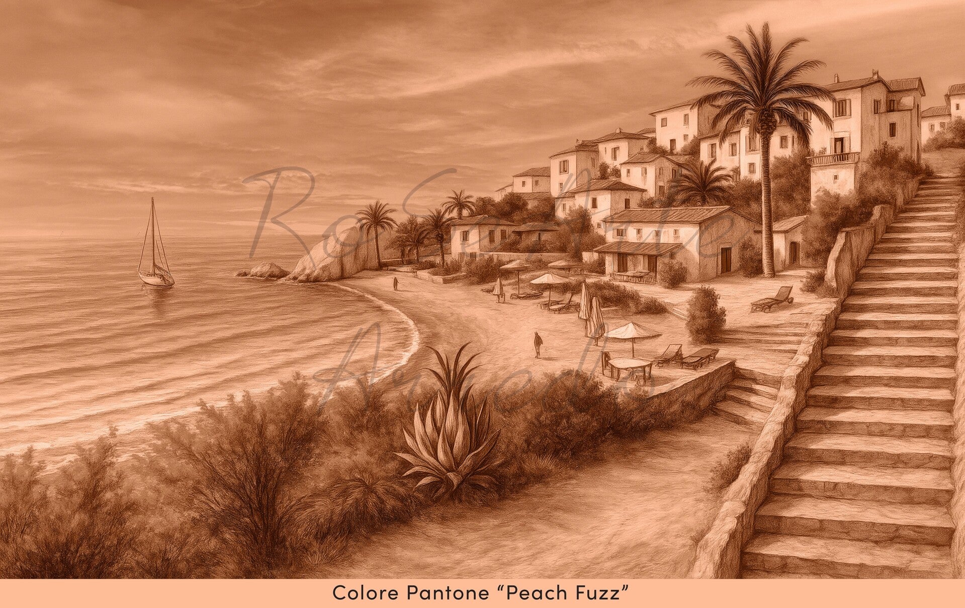 The sun gently caresses the stone staircase, leading the eye toward the golden beach and the crystal-clear sea.White houses with red-tiled roofs stand serenely among palms and Mediterranean plants.A solitary sail rests upon calm waters, while the air is filled with the scent of summer and freedom.In this corner of paradise, time seems to stand still, and the light becomes a gentle touch for the soul.