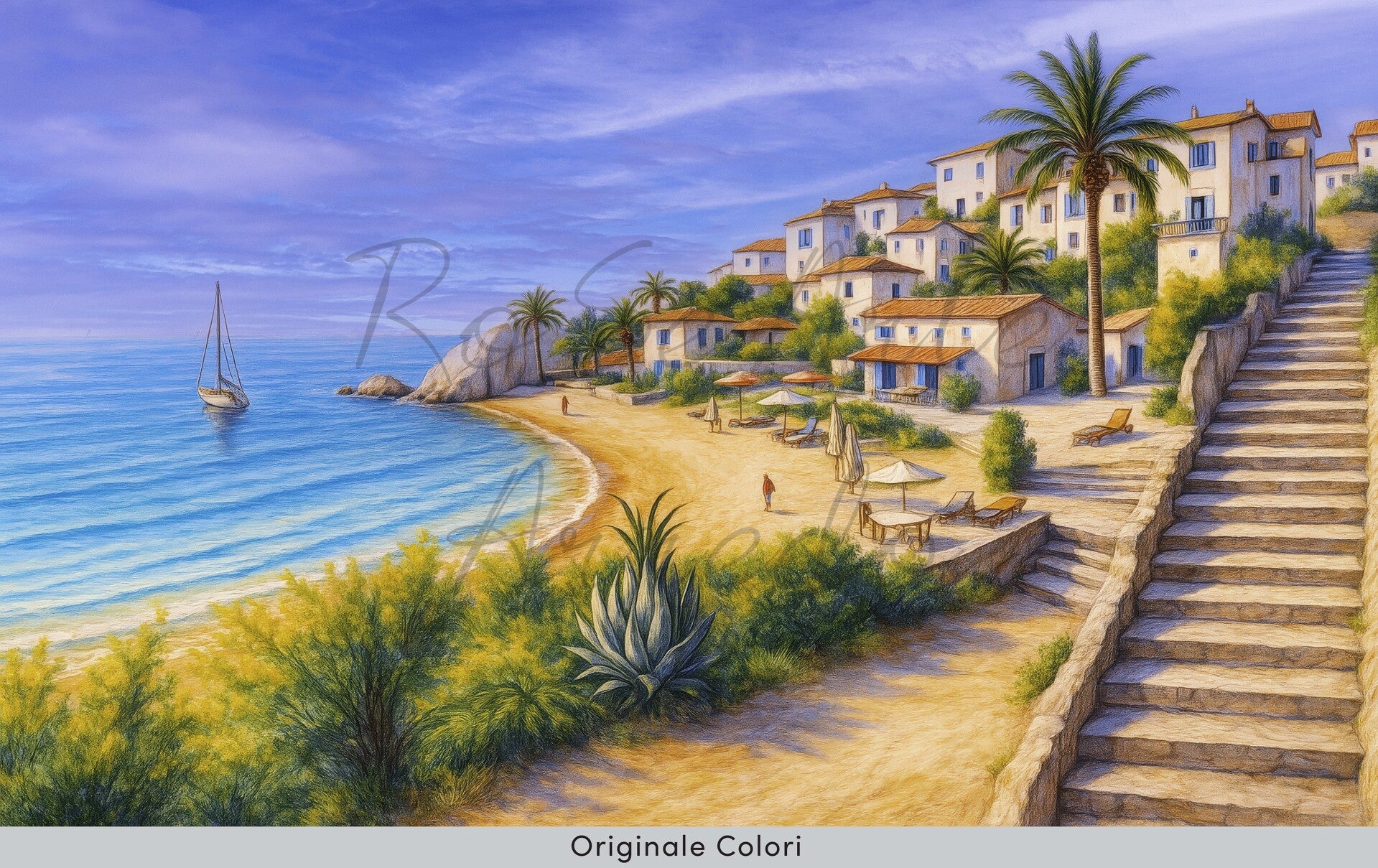 Il sole accarezza la scalinata di pietra, guidando lo sguardo verso la spiaggia dorata e il mare cristallino. Le case bianche dal tetto rosso si affacciano serene, immerse tra palme e piante mediterranee. Una vela solitaria riposa sull’acqua calma, mentre l’aria profuma di estate e libertà. In questo angolo di paradiso, il tempo sembra fermarsi e la luce diventa carezza per l’anima.