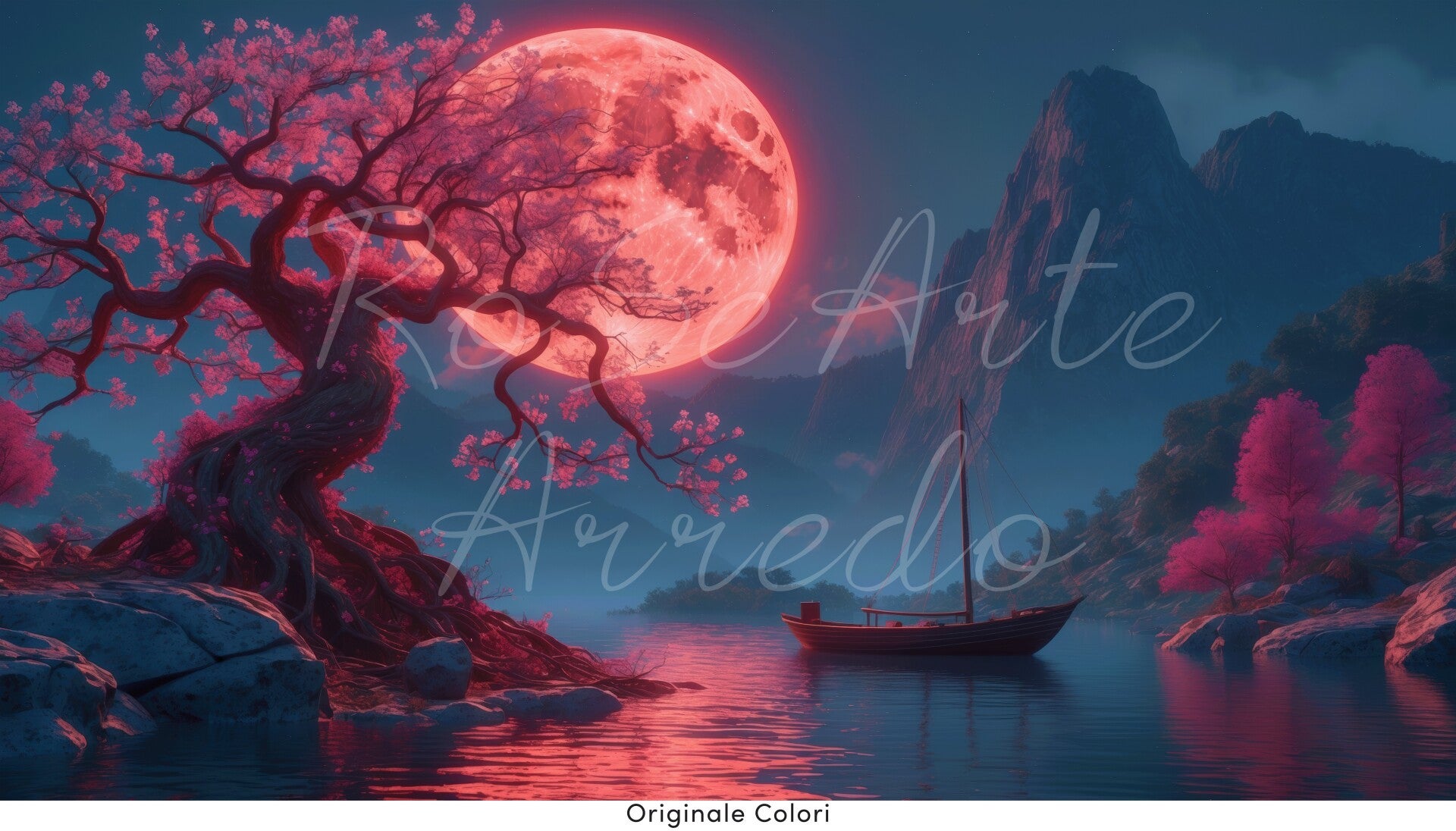 Sotto il cielo azzurro della notte, la luna si tinge di corallo e illumina i petali del ciliegio in fiore.Il tronco antico si piega verso l’acqua, come a specchiarsi nella sua stessa bellezza.Una barca silenziosa riposa sul lago, cullata da riflessi rosati e da un’aria di primavera eterna.È una notte sospesa, in cui la natura sussurra poesie a chi sa ascoltarle.