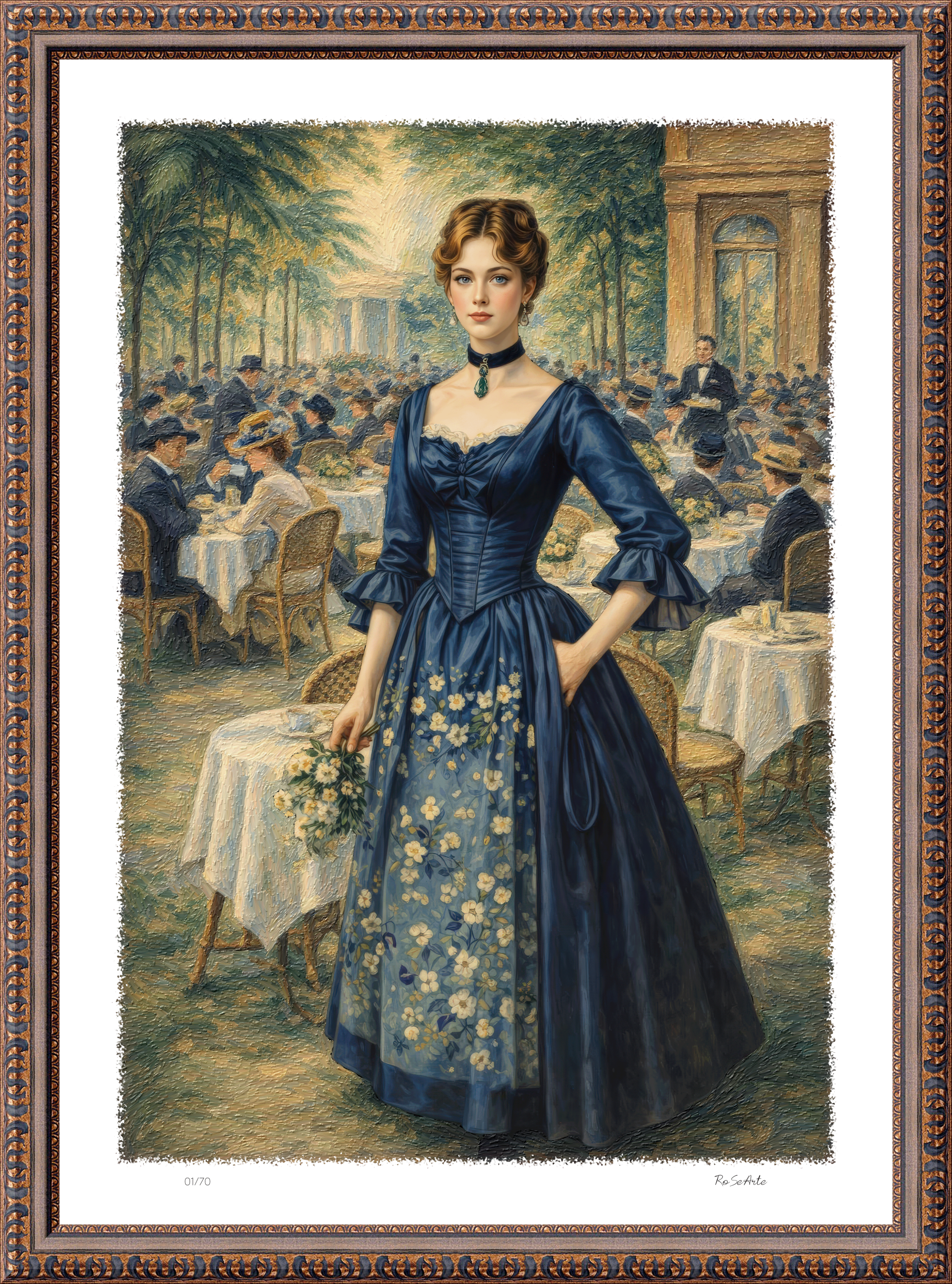 Tra il mormorio delle conversazioni e il tintinnio delle tazze, una figura si distingue nella folla.Il suo abito blu, impreziosito da delicati ricami floreali, cattura la luce e lo sguardo di chiunque passi. Dietro di lei, un vivace caffè all’aperto racconta storie di incontri e sogni condivisi.Il suo portamento fiero e lo sguardo sicuro sono il ritratto stesso della grazia senza tempo.