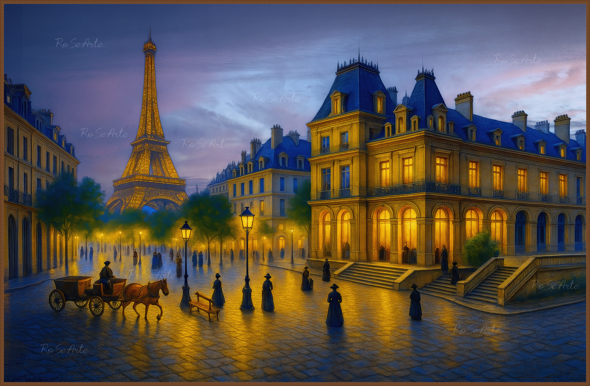 The cobblestone streets reflect the golden glow of the lampposts, while the Eiffel Tower shines like a queen in the Parisian night.Carriages and figures in period dress bring to life a city that breathes art, music, and dreams.It is the Belle Époque, an age of elegance and hope, when every stroll became a moment to remember.In this scene, time stands still, and Paris reveals its most romantic and timeless face.