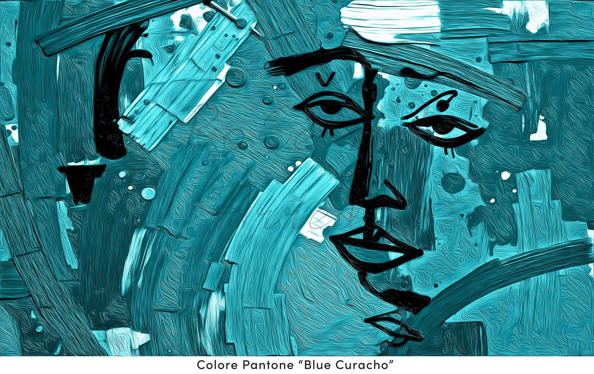 Un volto stilizzato emerge da un vortice di pennellate spesse e materiche, in un’esplosione di colori vivaci: rosso, verde, blu, giallo e rosa si intrecciano creando un’energia visiva travolgente. Le linee nere, nette e grafiche, definiscono i tratti del viso, mentre lo sfondo è un mosaico dinamico di texture e forme astratte. L’opera trasmette potenza espressiva e libertà creativa.