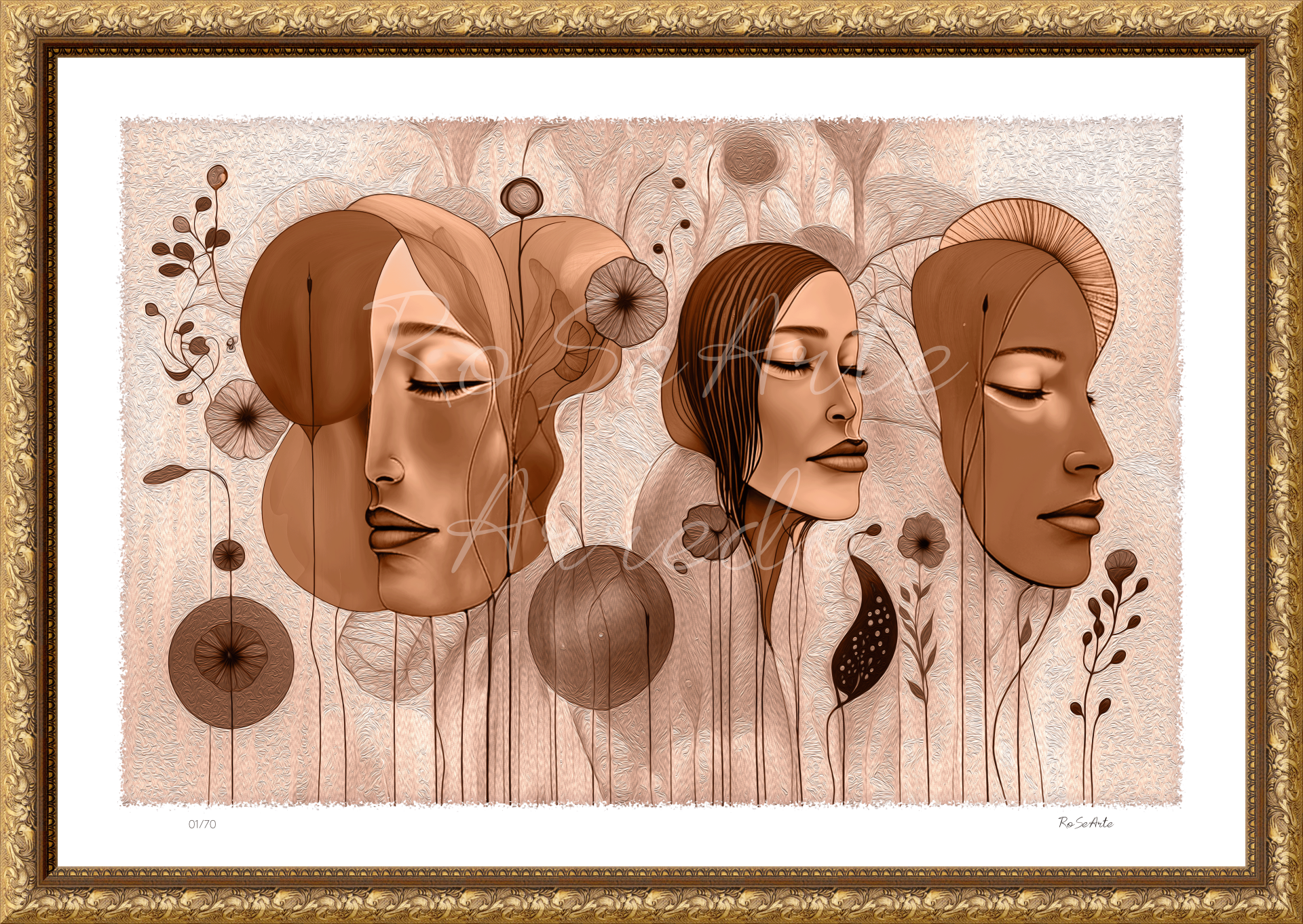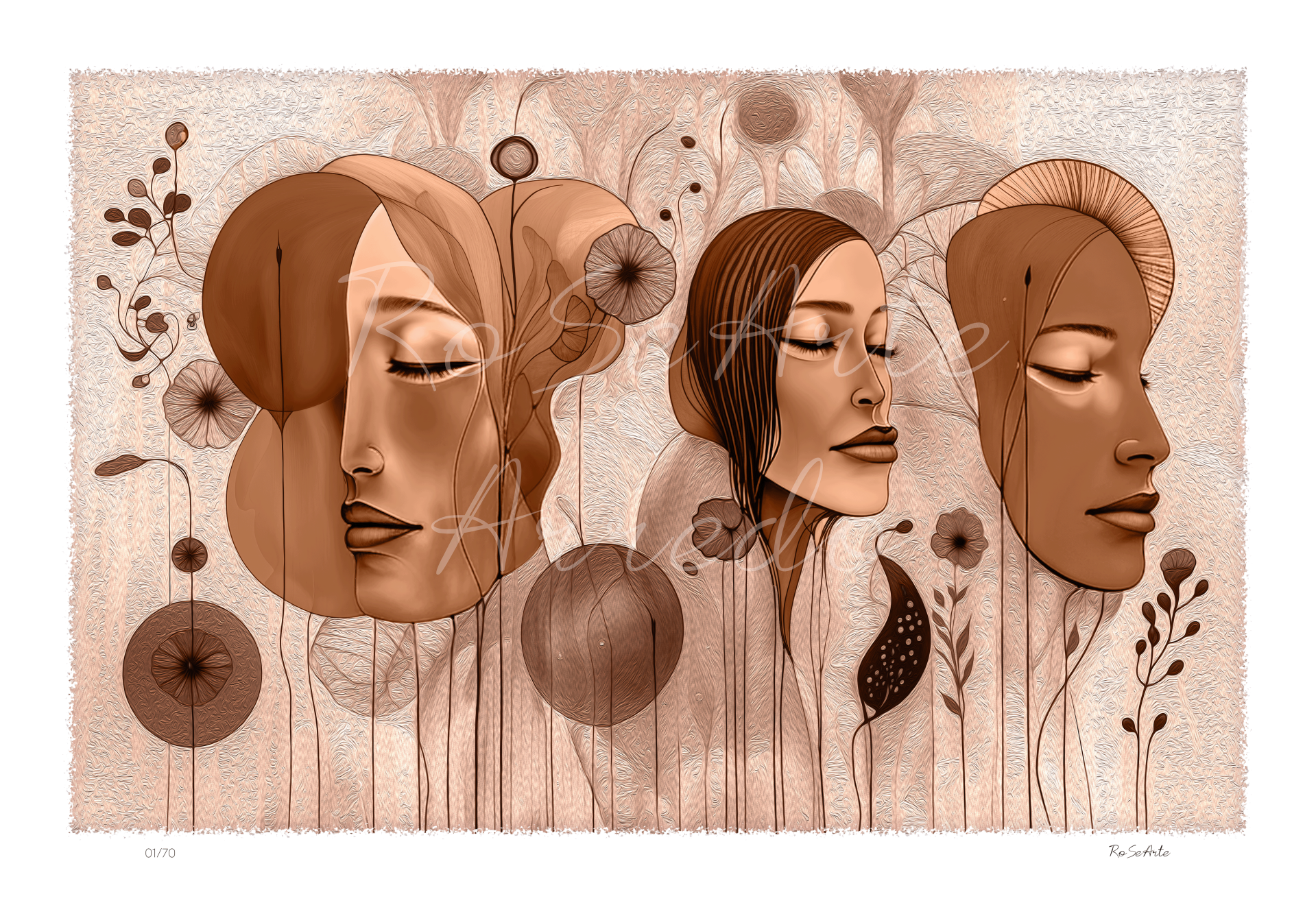 Three faces close their eyes, immersed in a garden that exists only in the stillness of the soul.Among suspended flowers and delicate shapes, nature intertwines with human beauty in a timeless embrace.Warm colors and soft shades wrap the scene like a slow breath, bringing peace and harmony.It is a dream scented with petals and silence, where every thought becomes a flower.