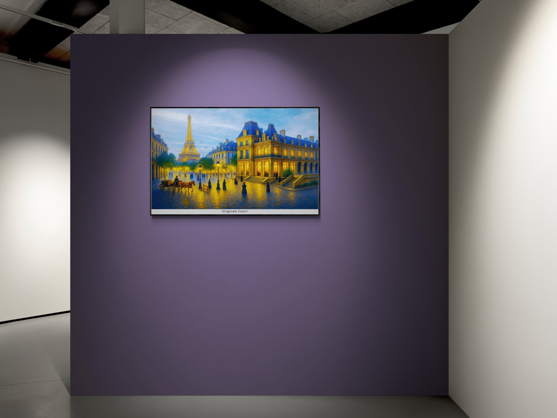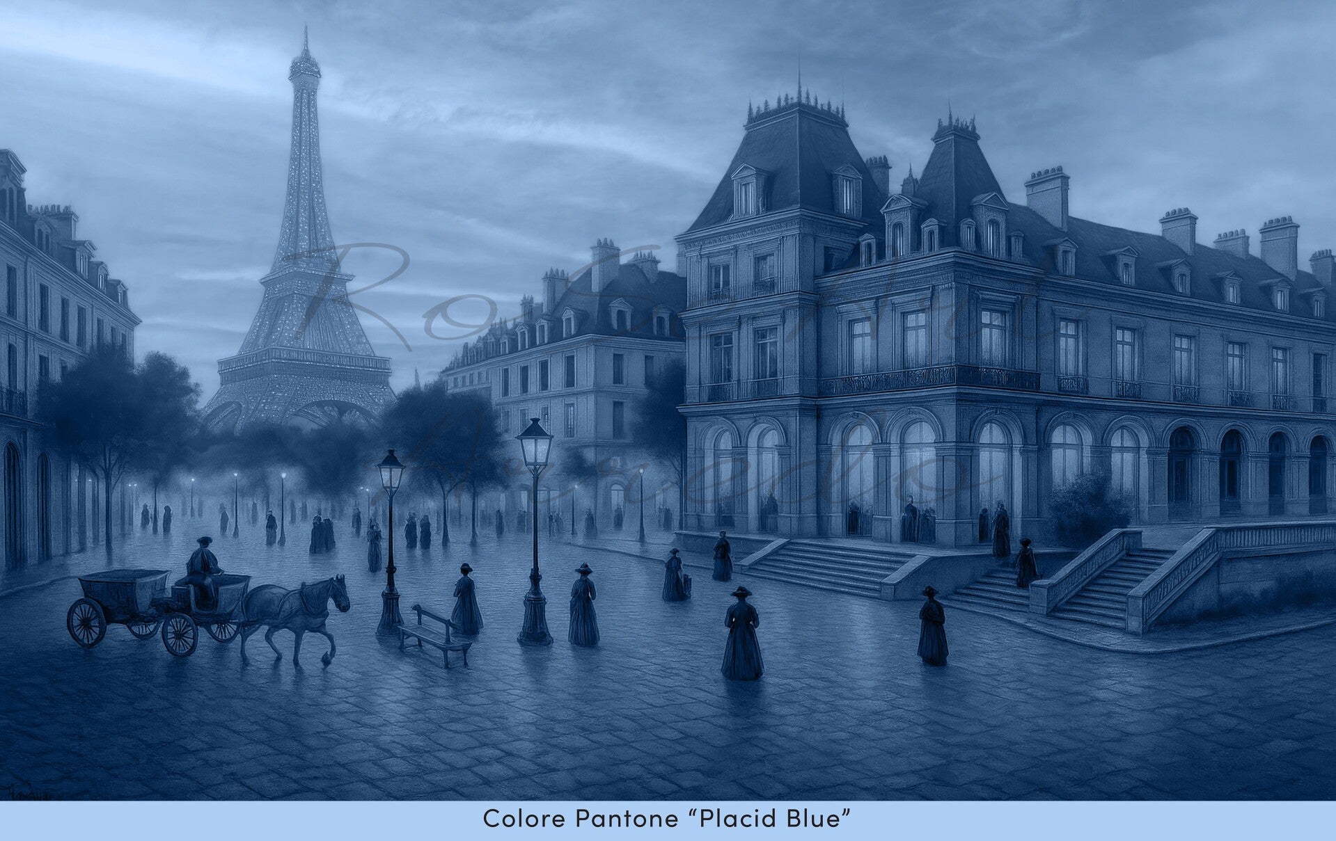 Le strade lastricate riflettono la luce dorata dei lampioni, mentre la Torre Eiffel brilla come una regina nella notte parigina. Carrozze e figure in abiti d’epoca animano una città che respira arte, musica e sogni.È la Belle Époque, un’era di eleganza e speranza, in cui ogni passeggiata diventava un momento da ricordare. In questa scena, il tempo si ferma e Parigi rivela il suo volto più romantico e senza tempo.