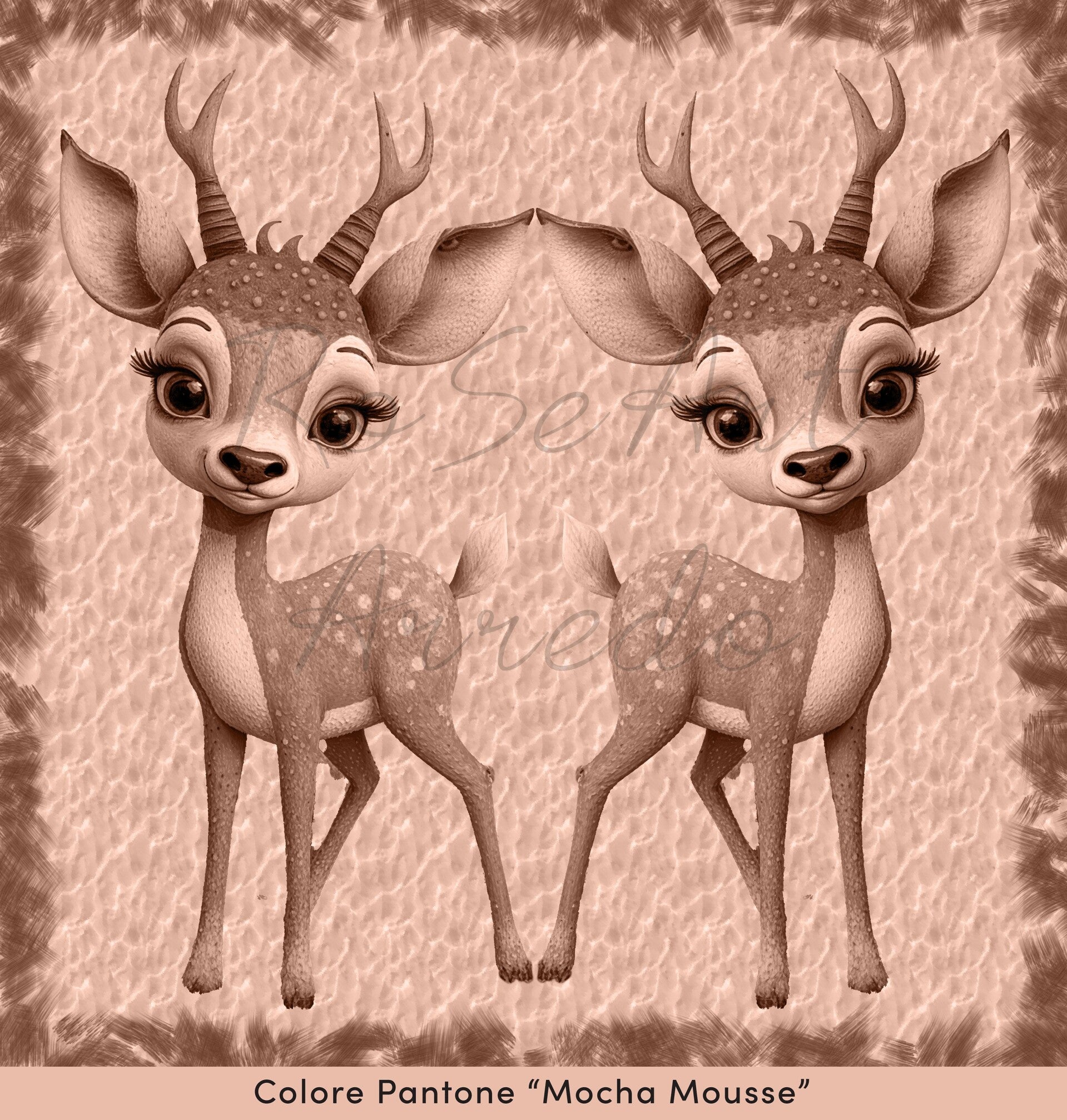 Two young fawns, depicted in perfect symmetry, embody grace and sweetness. The Pantone “Mocha Mousse” shade envelops the entire scene, bringing warmth and harmony to the image. Their tender, curious gaze seems to invite the viewer into the tranquility of the forest.