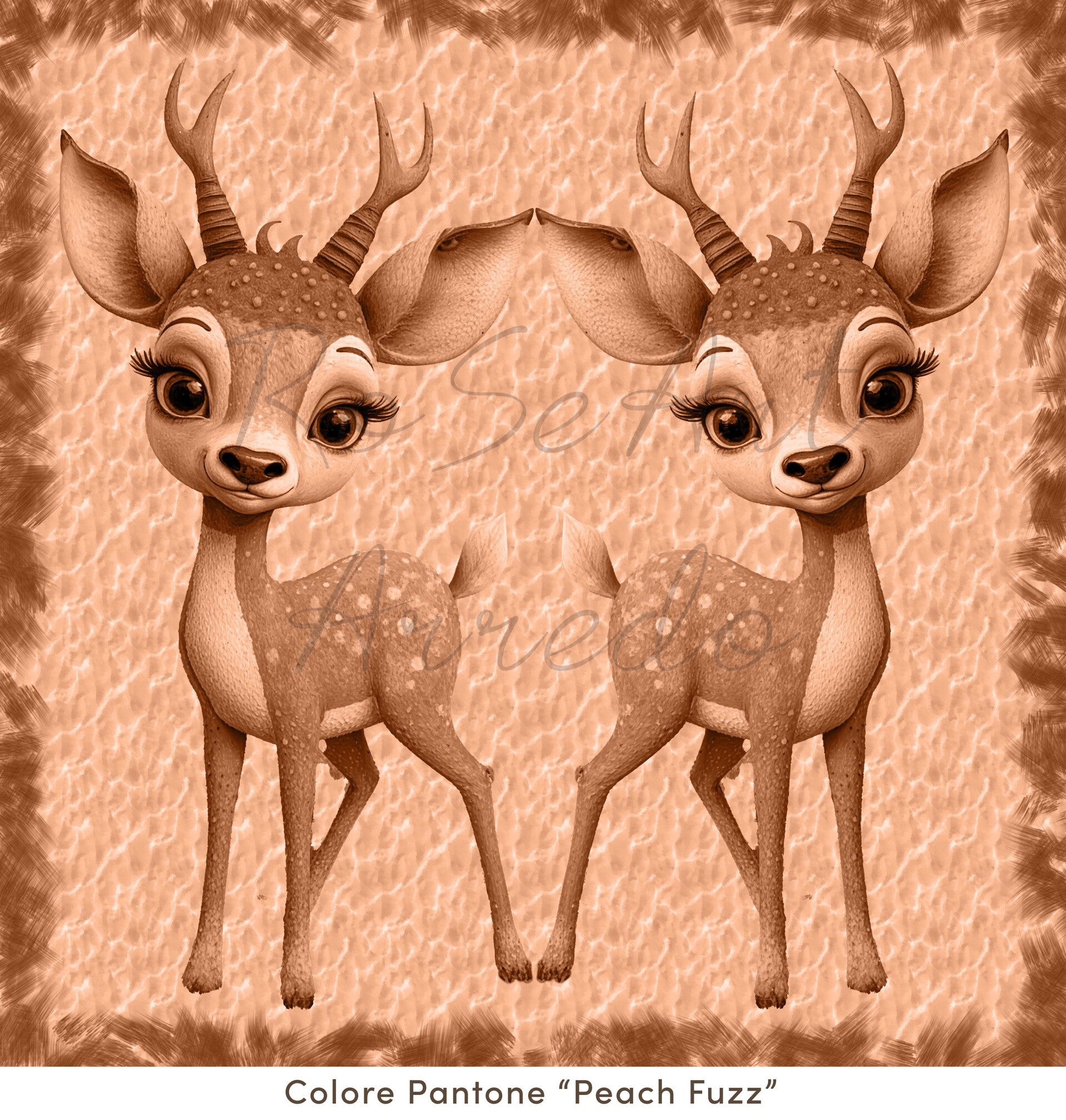 Due giovani cerbiatte, ritratte in simmetria perfetta, incarnano grazia e dolcezza. La tonalità Pantone “Mocha Mousse” avvolge l’intera scena, donando calore e armonia all’immagine. Uno sguardo tenero e curioso, che sembra invitare lo spettatore a entrare nella quiete del bosco.