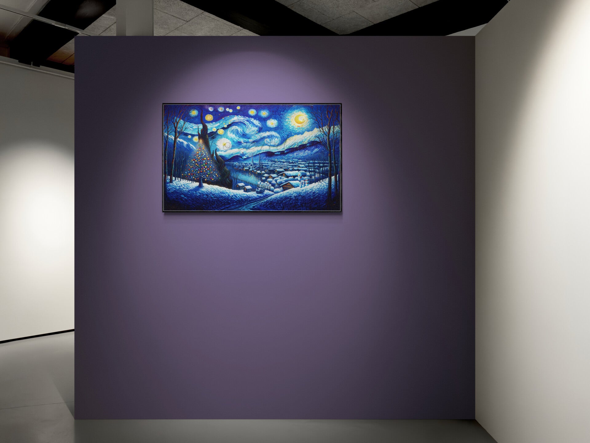 Il cielo vorticoso avvolge il villaggio in un abbraccio di stelle, mentre la neve riflette mille sfumature di blu.Tra i cipressi e gli alberi spogli, un abete addobbato illumina la collina, portando calore alla notte d’inverno. Le case, avvolte dal silenzio, custodiscono il tepore delle famiglie riunite, mentre pupazzi di neve vegliano gioiosi sui sentieri imbiancati. È Natale: la luce delle stelle si unisce a quella dei cuori, e ogni respiro profuma di pace e meraviglia.