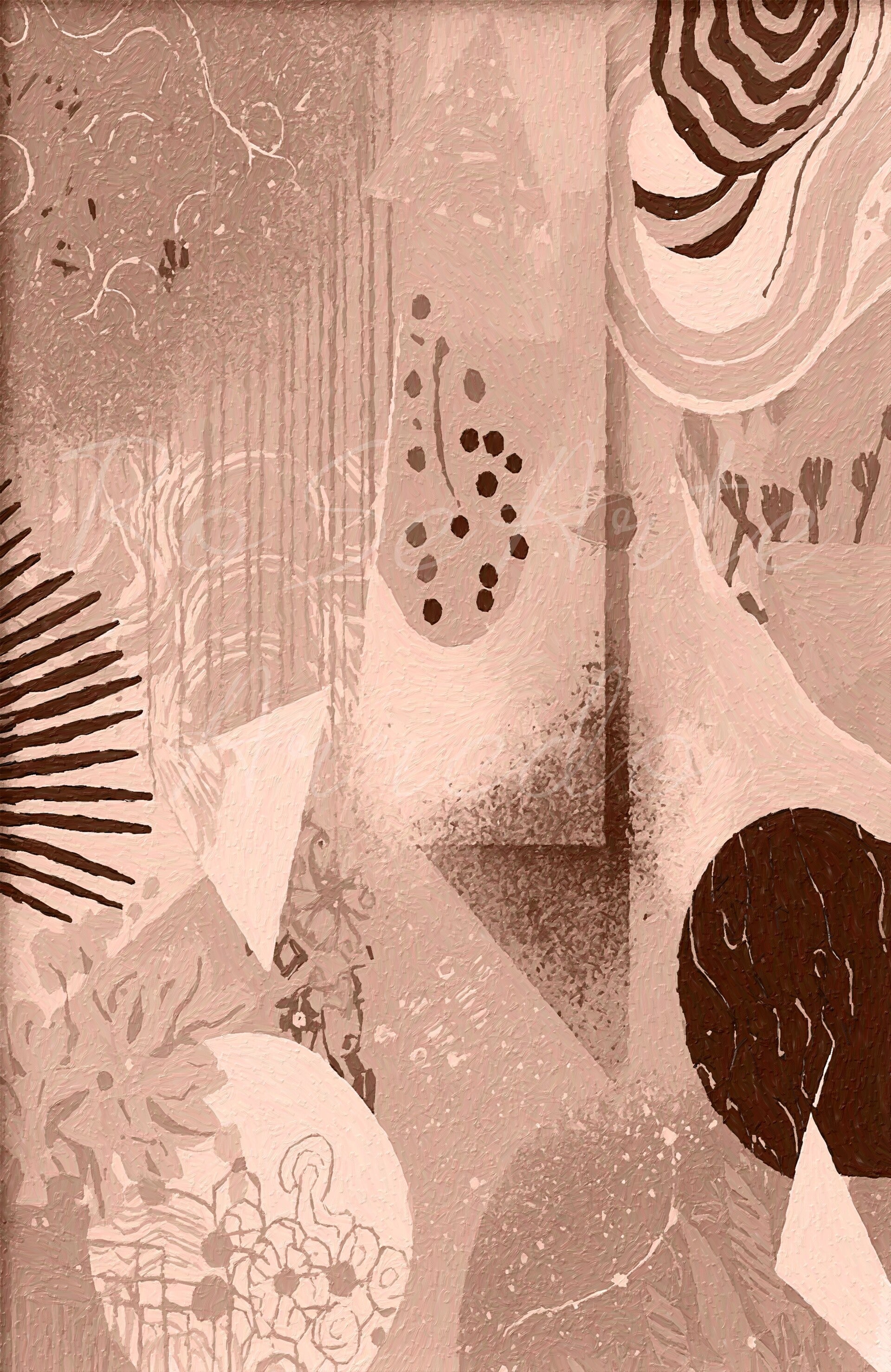 Un intreccio di forme astratte e segni organici che si fondono in una composizione armoniosa. Cerchi, linee e motivi botanici si sovrappongono creando un dialogo tra natura e astrazione contemporane