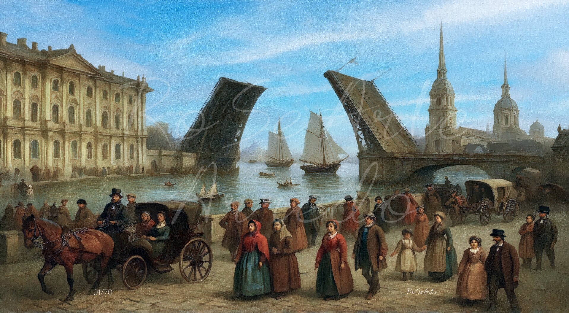 Un frammento di San Pietroburgo ottocentesca prende vita sulle rive della Neva. Carrozze, passanti e velieri animano la scena in un momento sospeso tra storia e poesia, dove la luce del Nord accarezza pietra e acqua con un’eleganza senza tempo.