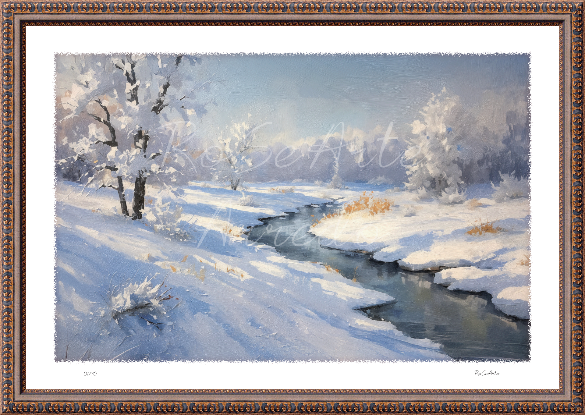 Un paesaggio dove il silenzio sembra respirare. La neve avvolge ogni cosa con dolcezza, mentre un piccolo ruscello apre un varco di luce e riflessi. Il bianco e l’azzurro si fondono in un abbraccio di pace e malinconia, come un pensiero che scorre piano tra i giorni d’inverno.