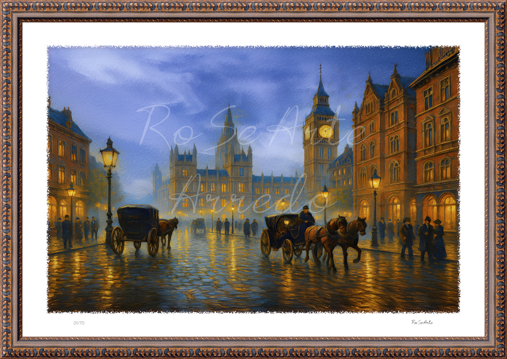 Un’atmosfera vittoriana sospesa tra sogno e realtà: le carrozze avanzano lente sul selciato lucido di pioggia, mentre i lampioni dorati riflettono la vita pulsante della città. Sullo sfondo, il Parlamento e il Big Ben vegliano maestosi, illuminati da un cielo blu intenso che abbraccia la scena. È Londra che si rivela nella sua veste più romantica e senza tempo.