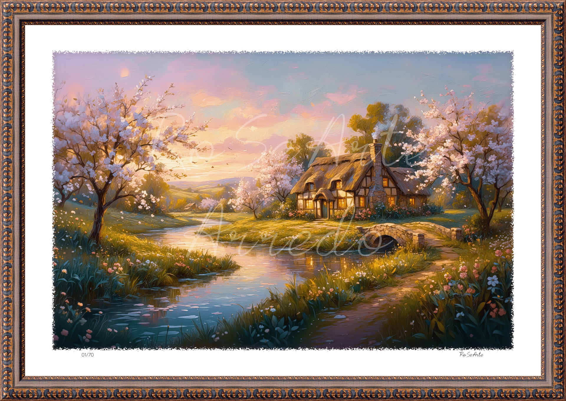 Where time slows down and light gently embraces everything, a refuge emerges between dream and nature. The river guides the eye toward a warm, quiet home, while spring blossoms whisper the promise of new beginnings.