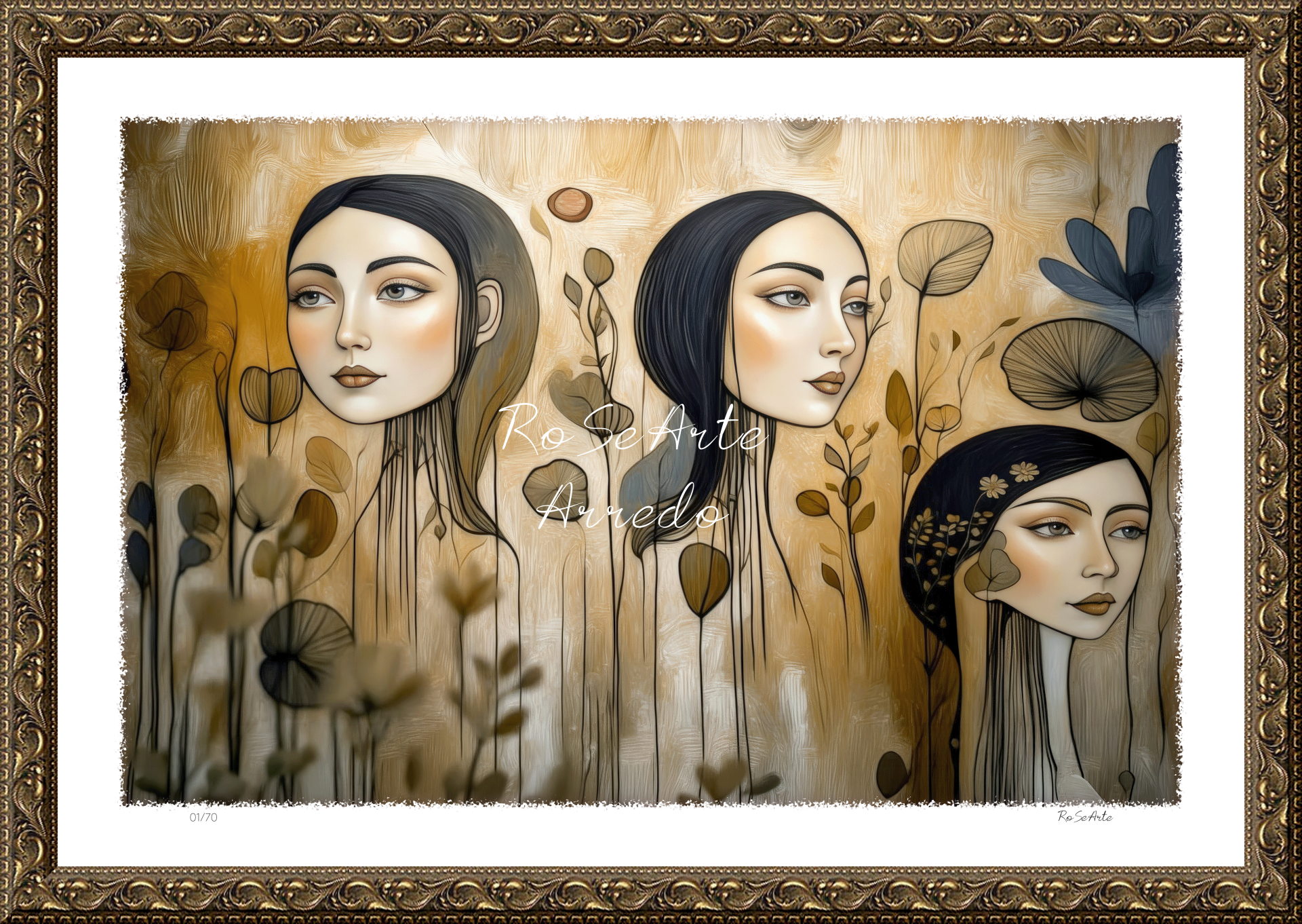 Three feminine presences emerge from a suspended landscape between nature and thought.Their open gazes do not seek, but hold quiet emotions within.Flowing lines descend like invisible roots, connecting face and earth in a delicate balance.An artwork that brings calm, depth, and timeless beauty into any space.